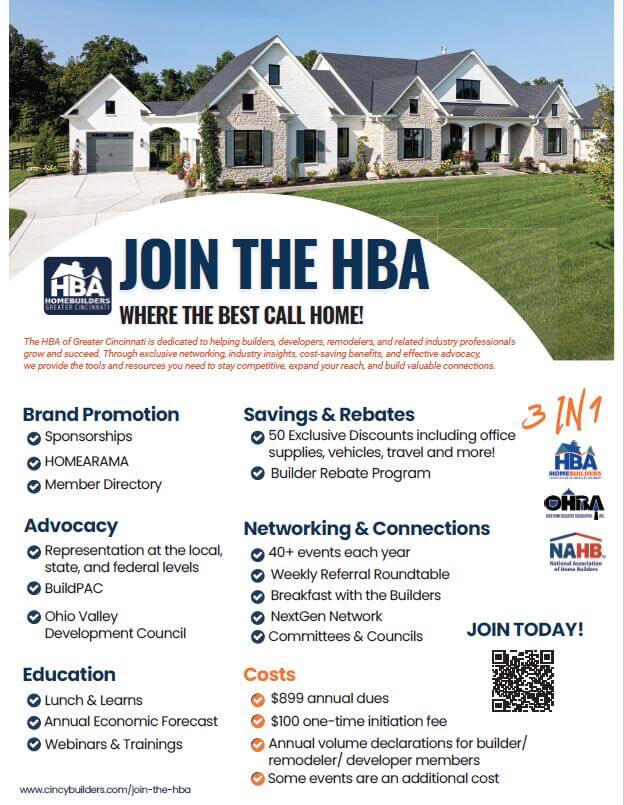 The HBA of Greater Cincinnati is dedicated to helping builders, developers, remodelers, and related industry professionals grow and succeed. Through exclusive networking, industry insights, cost-saving benefits, and effective advocacy, we provide the tools and resources you need to stay competitive, expand your reach, and build valuable connections.